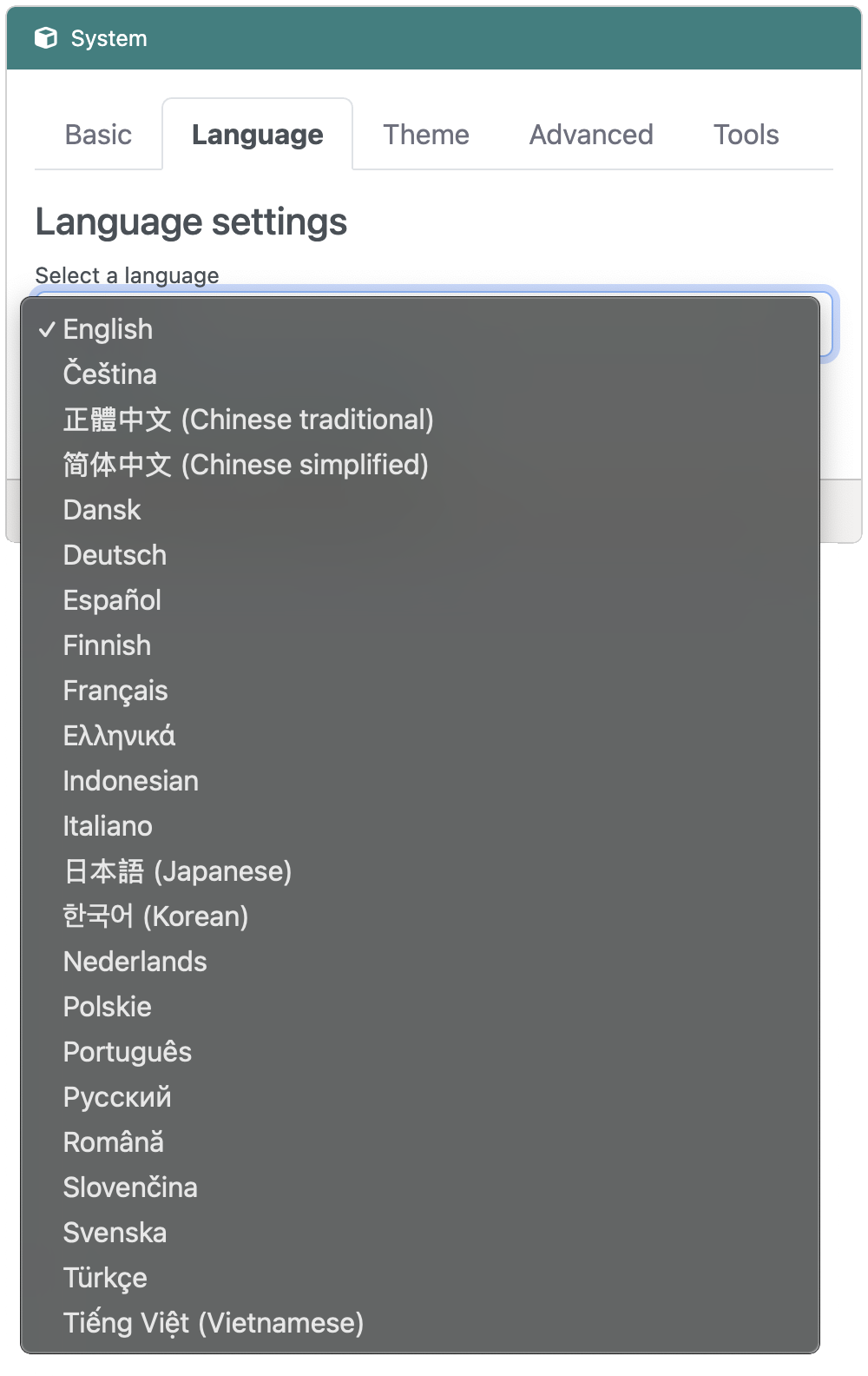 Whichever installation method you use, you can manually select a different language at any time from the Language tab in the System menu.